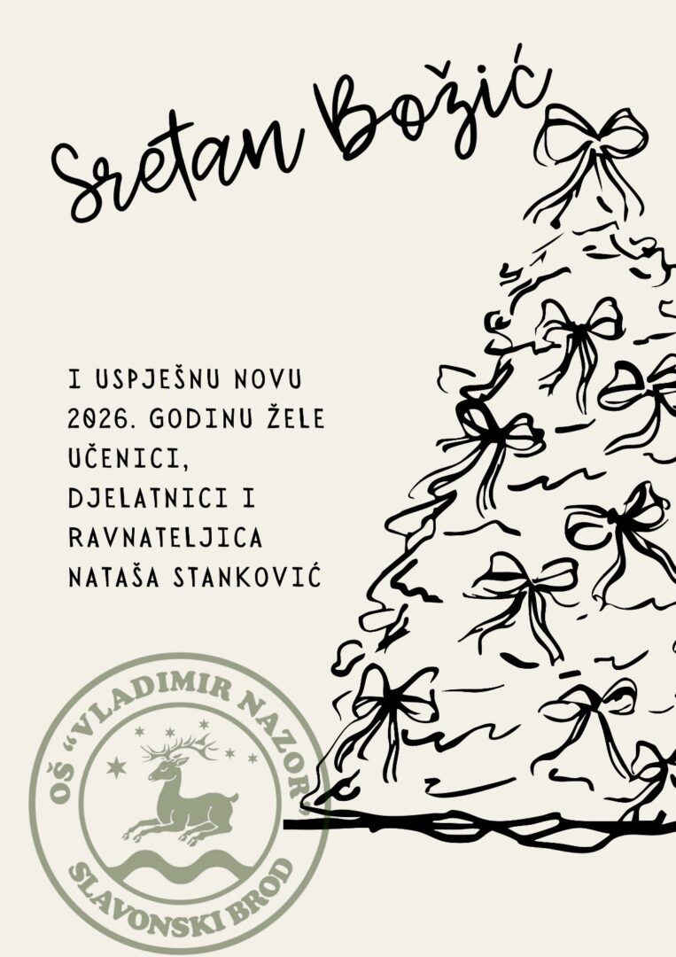 Povodom Božića i nadolazeće Nove godine, svim učenicima, roditeljima i djelatnicima škole želimo obilje zdravlja, mira, radosti i uspjeha. Neka blagdani donesu toplinu u vaše domove, a Nova godina nove prilike, znanje i zajedničke uspjehe.