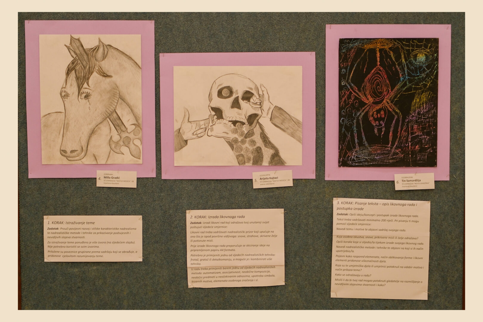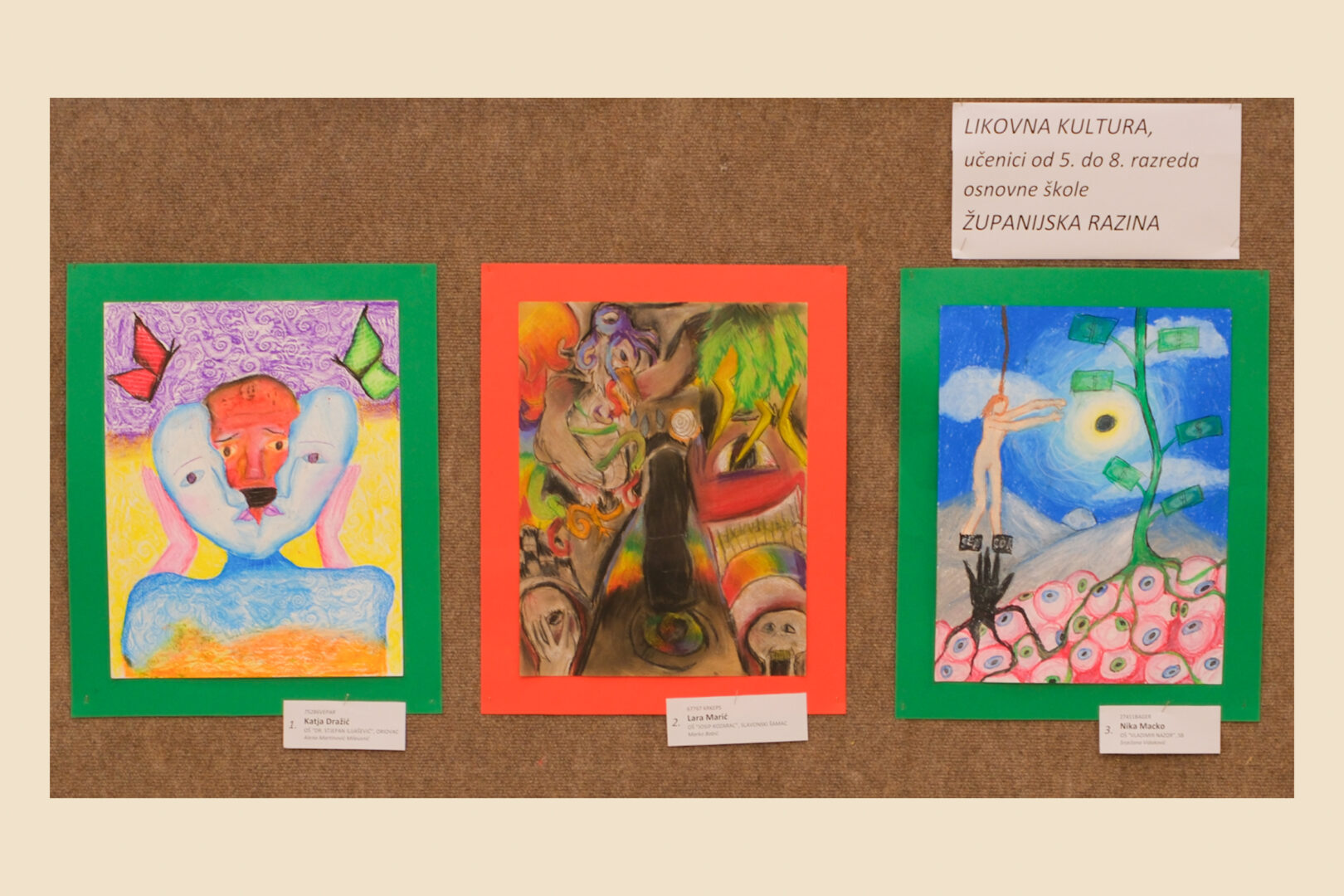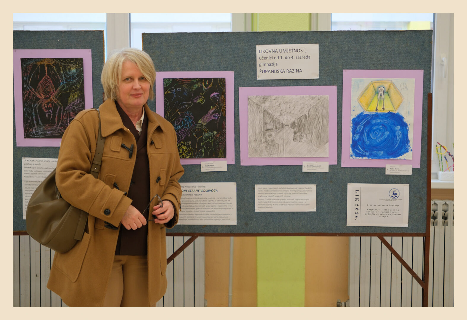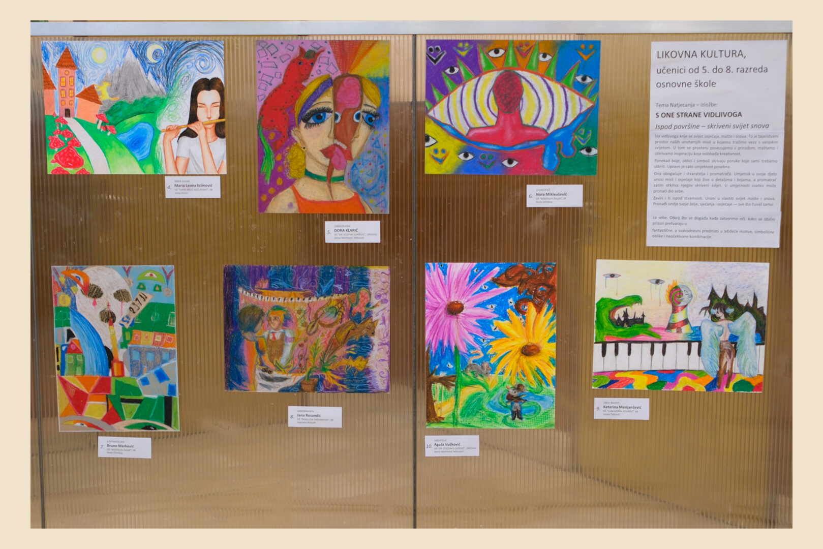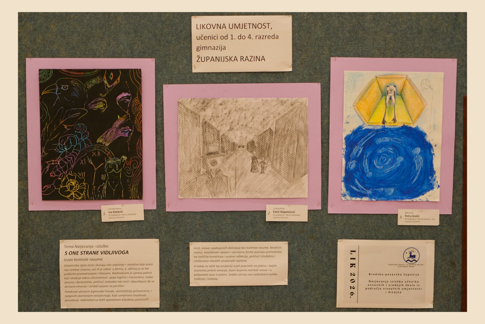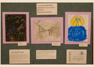 Riječ je o izložbi likovnih radova učenika osnovnih i srednjih škola iz područja vizualnih umjetnosti i dizajna, koja je i ove godine pokazala koliko su kreativnost, mašta i likovni izričaj mladih snažni i inspirativni. Tema ovogodišnjeg natjecanja bila je „S one strane vidljivoga“, a učenici su kroz različite tehnike i pristupe ponudili vlastite, duboko promišljene interpretacije zadane teme.